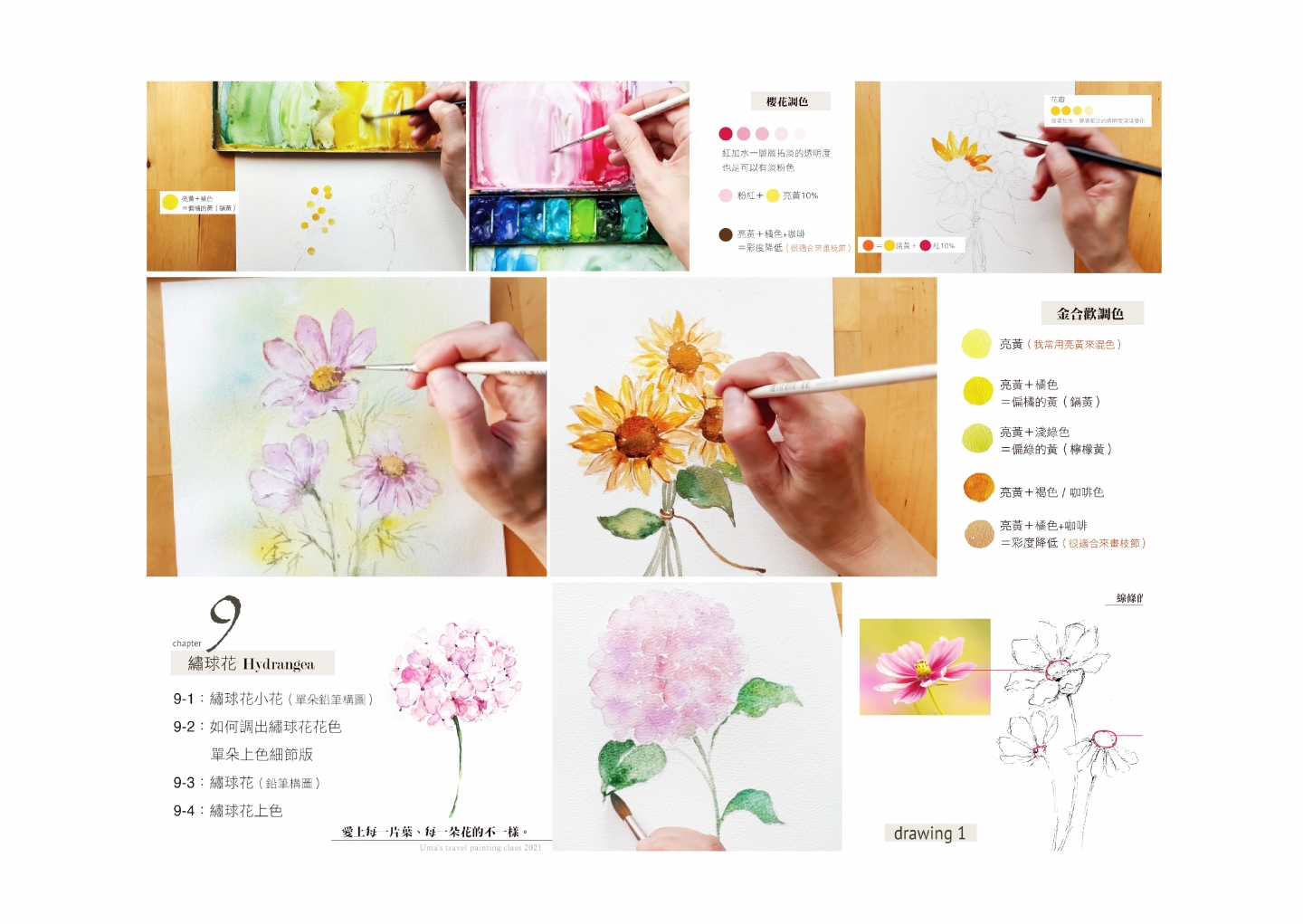 一、水彩工具與技法介紹(2堂)二、花草植物實戰:各種花型掌握&上色技巧(7堂 )三、活用篇:手繪的花草插畫與排版的視覺運用(2堂)四、渲染浪漫:背景的上色技巧與層次運用(2堂)