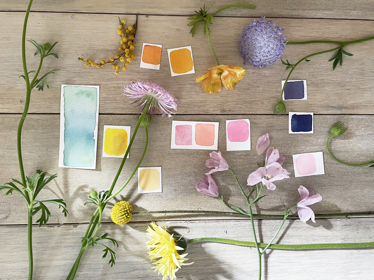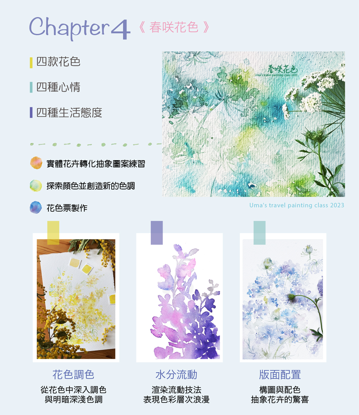 《從花色中找靈感》探索顏色,試驗顏色混色。課程裡會設計幾種方法去練習。