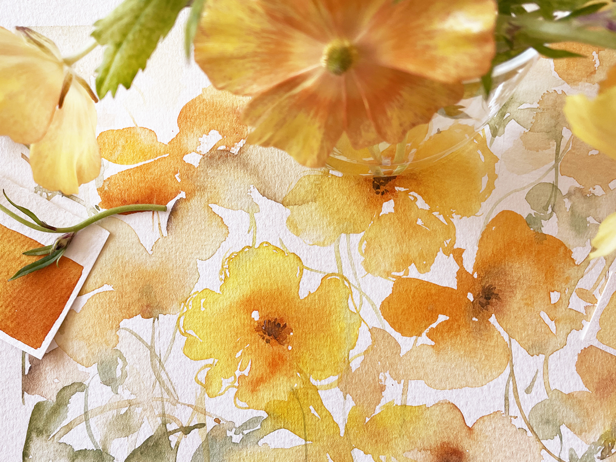 《花卉色彩與構圖》課程裡的花色主題有深入的引導步驟,並讓同學去練習花卉色彩與構圖。