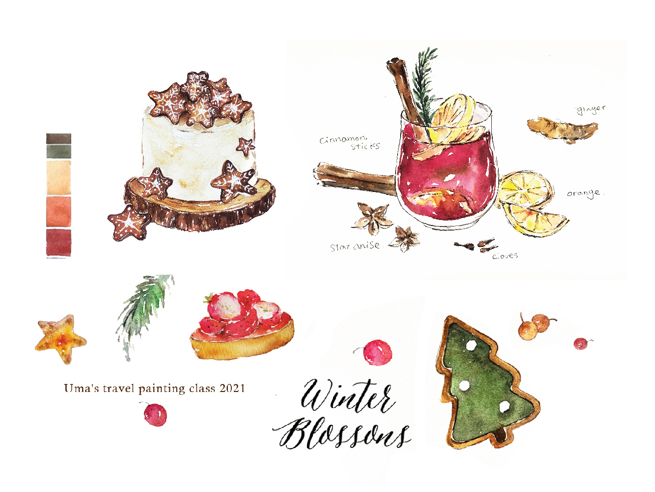 - 繽紛色彩甜點與熱紅酒:除了甜點形體掌握,更進入立體透視,以及如何好好吃的調色運用。
