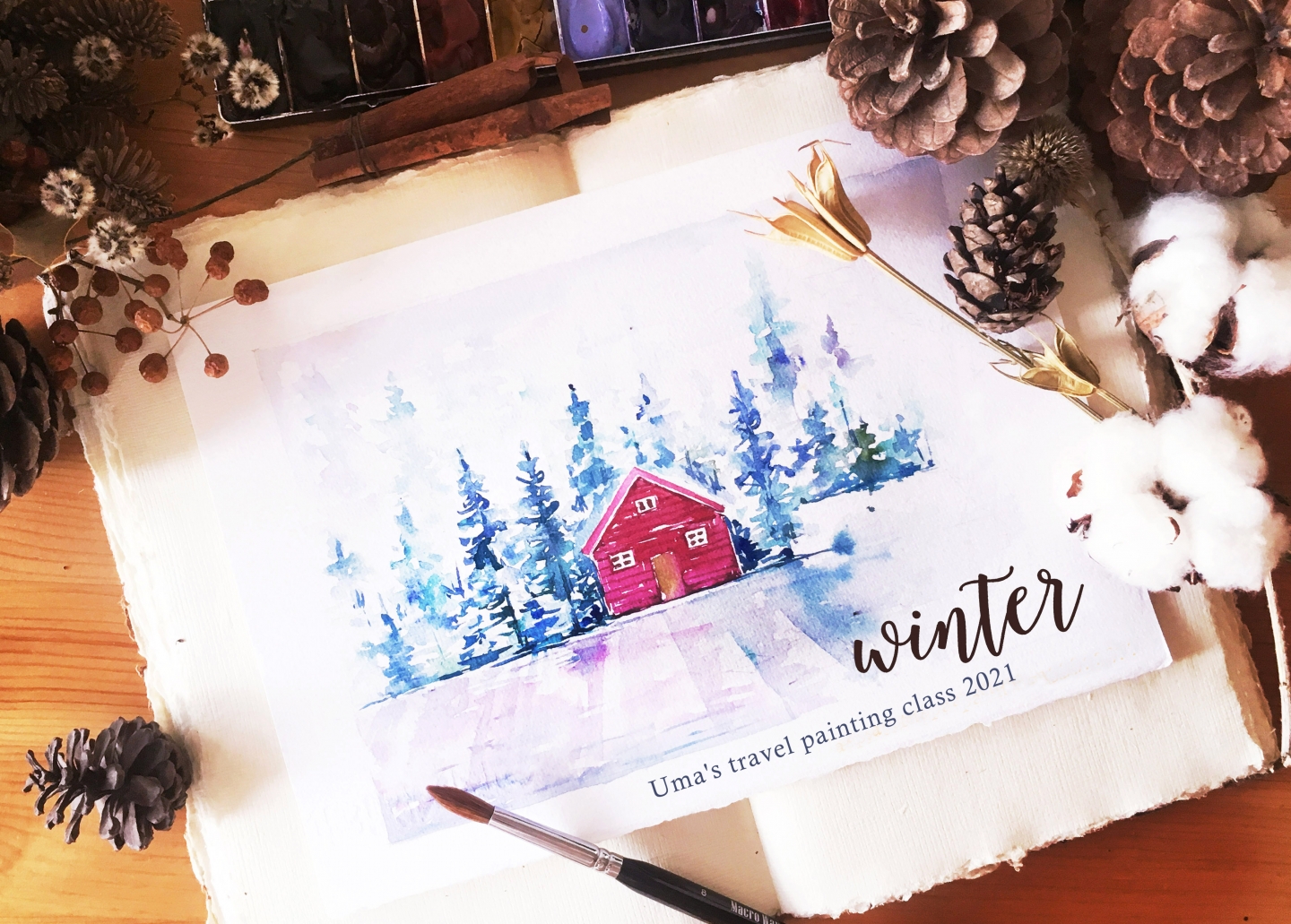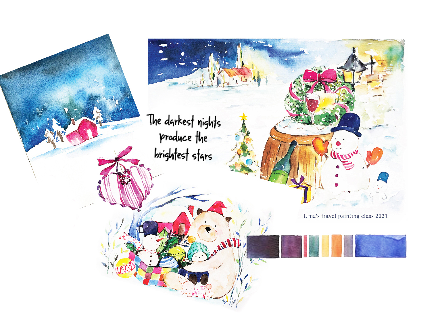 一、水彩工具與技法介紹(2堂)二、北歐森林冬季花草系列(3堂)三、北歐甜點與熱紅酒系列(3堂)四、北歐森林,極光與雪景系列(4堂)