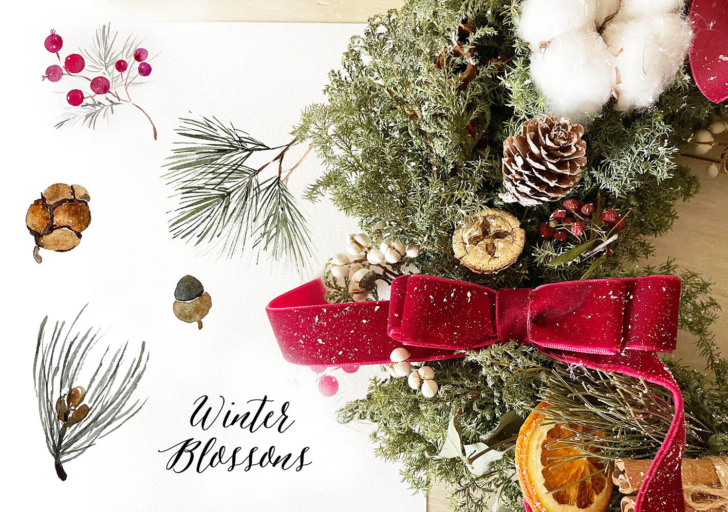 課程集結北歐旅程風景- 北歐祝福花圈實戰:從冬季花草的素材去運用各種的花圈組合與色彩配色平衡。